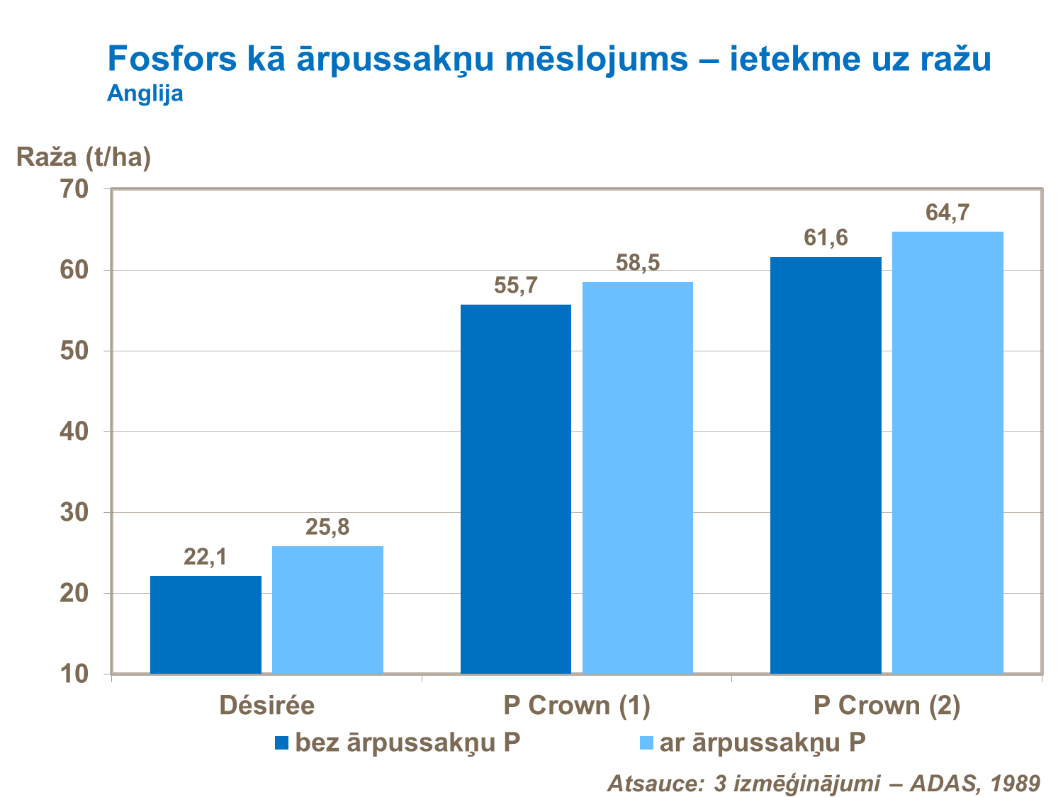 Šie neatkarīgie pētījumi, kas veikti Anglijā, parāda konsekventu ražas pieaugumu no fosfora kāārpussakņu mēslojuma lietošanas pēc bumbuļu aizmešanās, kā rezultātā palielinās bumbuļu lielums un kopējā raža.
