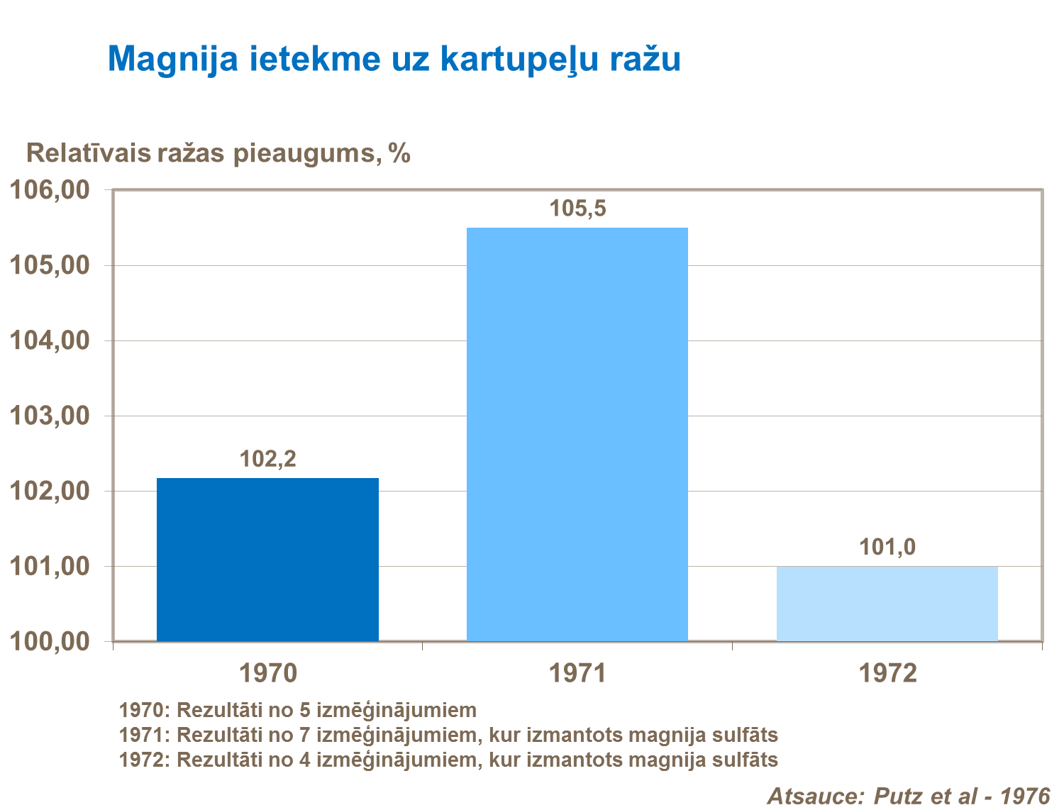 Augsnēs, kur trūkst magnija, negūtās ražas apjoms var būt līdz pat 15% , šādos gadījumos magniju saturoša mēslojuma lietošana katru gadu var sniegt ražas pieaugumu no 1 līdz 10%, apliecina izmēģinājumu dati.