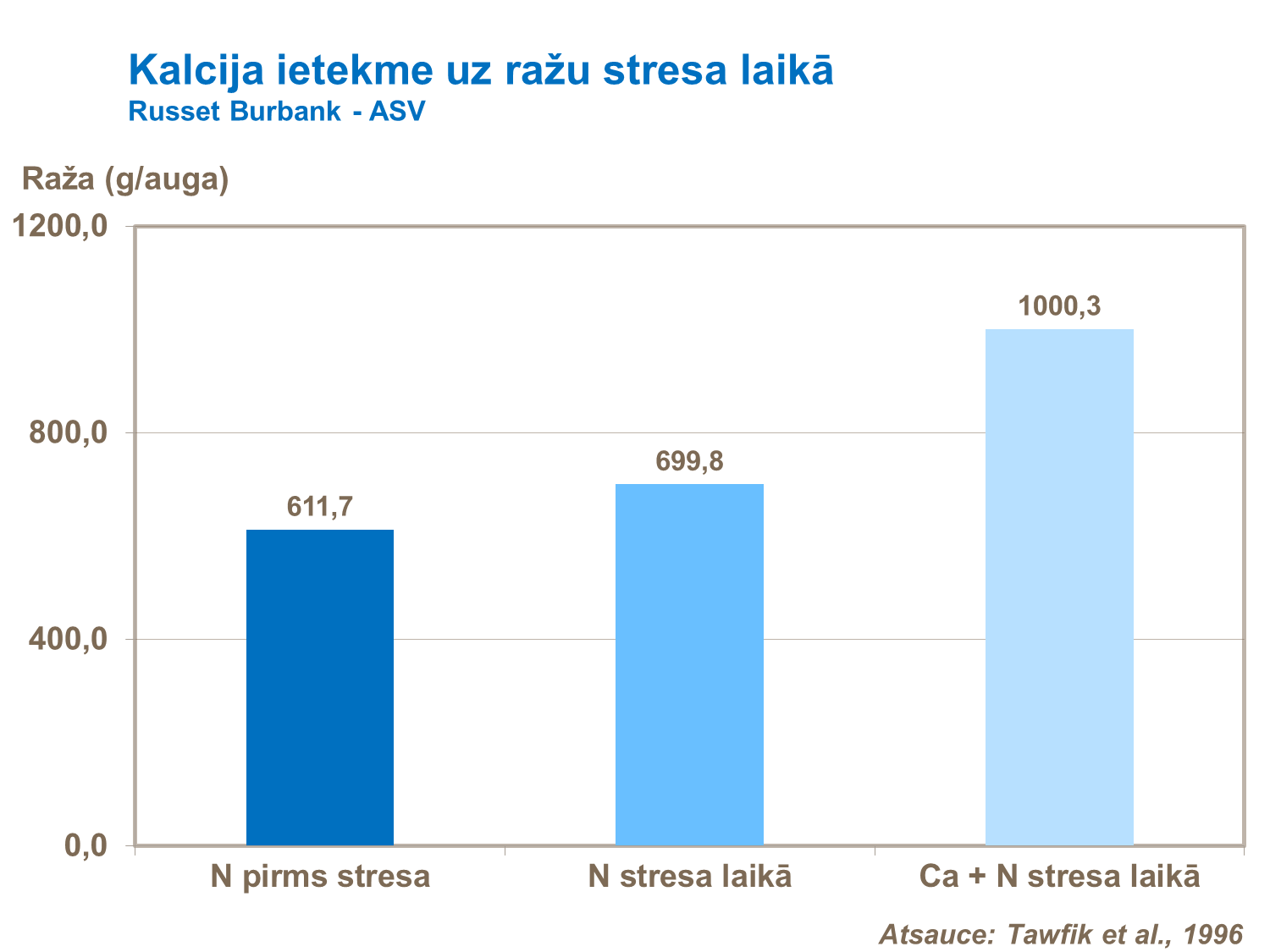 Šis pētījums parāda ieguvumu no kalcija lietošanas stresa apstākļos - trešais stabiņš apliecina būtisku ražas pieaugumu.