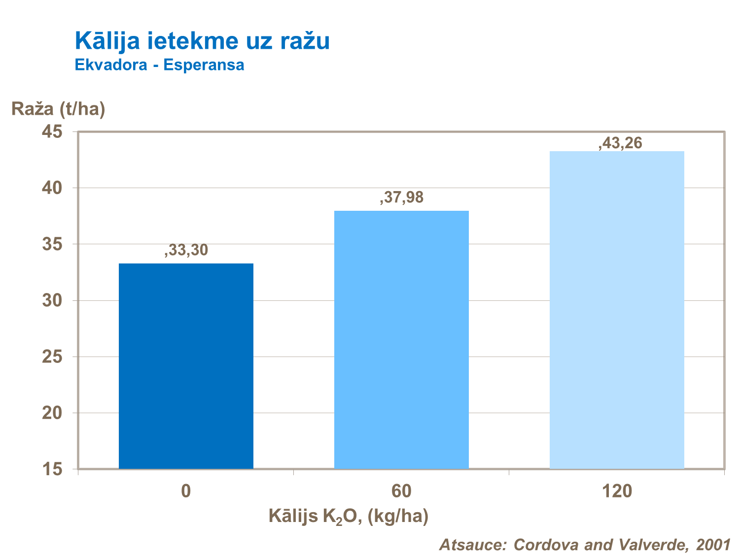 Piecos izmēģinājumos, trīs gadu garumā, kas veikti ar kāliju bagātās vulkāniskajās augsnēs, 120 kg K2O/ha palielināja ražu par 10t/ha.