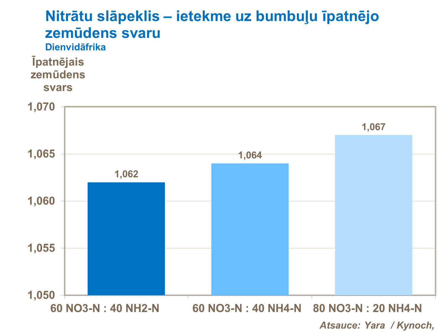 Nitrātu slāpeklis arī veicina katjonu uzņemšanu augā, piemēram, kalcija, kālija un magnija uzņemšana paaugstina bumbuļu blīvumu.