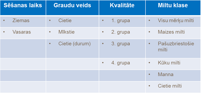 Tās ir šķirnes, kas dod vienmērīgu malšanas un cepšanas kvalitāti. Miltu ražotāji piedāvā papildu samaksu pie bāzes cenas, ja tiek sasniegti sekojoši graudu kvalitātes rādītāji – 13 % olbaltumvielu, 250 s krišanas skaitlis un 76 kg/hl tilpummasa.