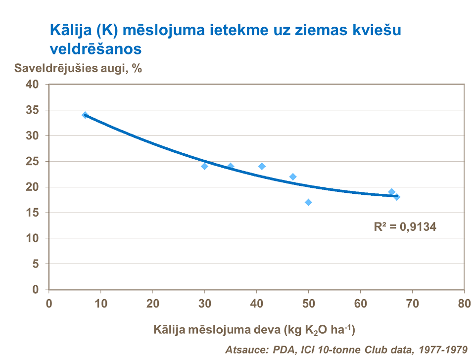 Atbilstošam pieejamā kālija saturam ir būtiska nozīme augstas kvalitātes graudu ražas veidošanā ar labu tilpummasu un labi pildītiem graudiem. Kālija trūkums var radīt priekšlaicīgu nogatavošanos ar ievērojami zemāku individuālo graudu rupjumu un svaru, kā arī var izsaukt tukšas graudu vietas vārpā, kas samazina no vārpas iegūstamo graudu skaitu.