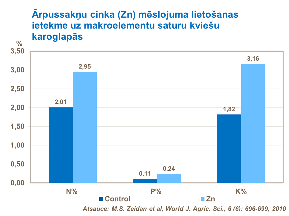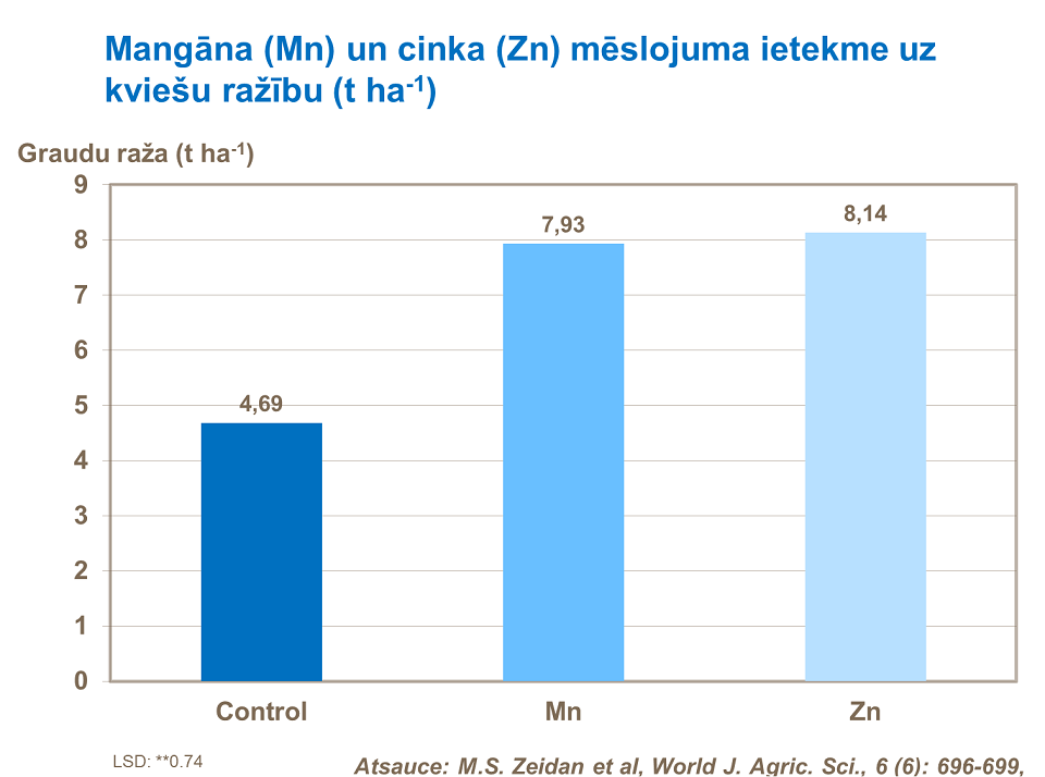 Mangāns un cinks ir divi svarīgi mikroelementi, kas ietekmē ražu veidojošos komponentus, piemēram, palielina vārpu skaitu un graudu izmēru, kā rezultātā palielinās novācamā graudu raža.