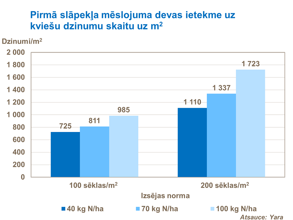 Tur, kur dzinumu skaits ir zem optimālā, lietojot augstākas slāpekļa mēslojuma devas agri sezonas sākumā (AS 25-30), palielināsies dzinumu skaits un līdz ar to arī vārpu skaits.