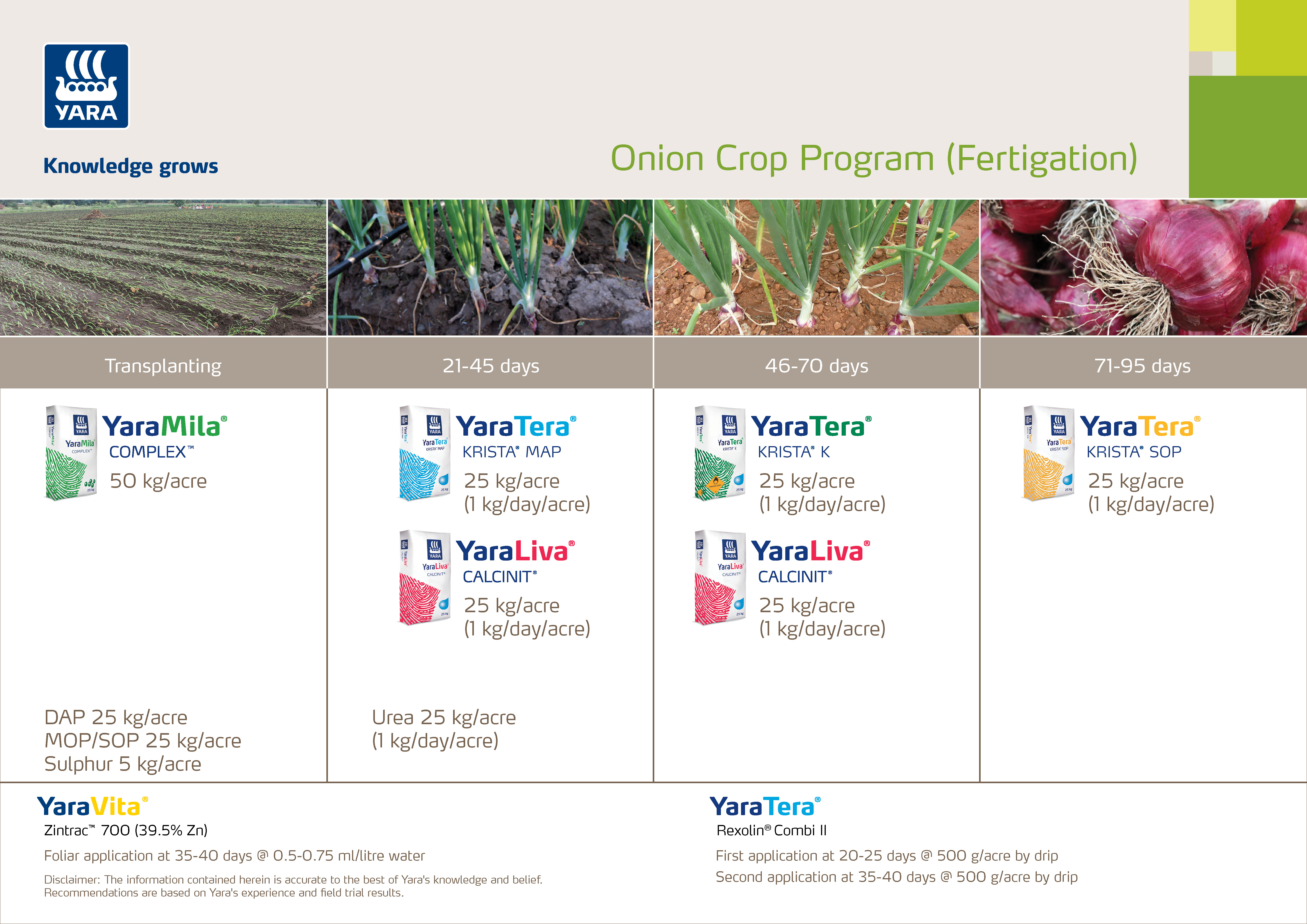 Yara’s fertigation program for onion is based on soil application of YaraMila compound NPK fertilisers and fertigation with YaraTera, YaraLiva as well as foliar application of YaraVita products.