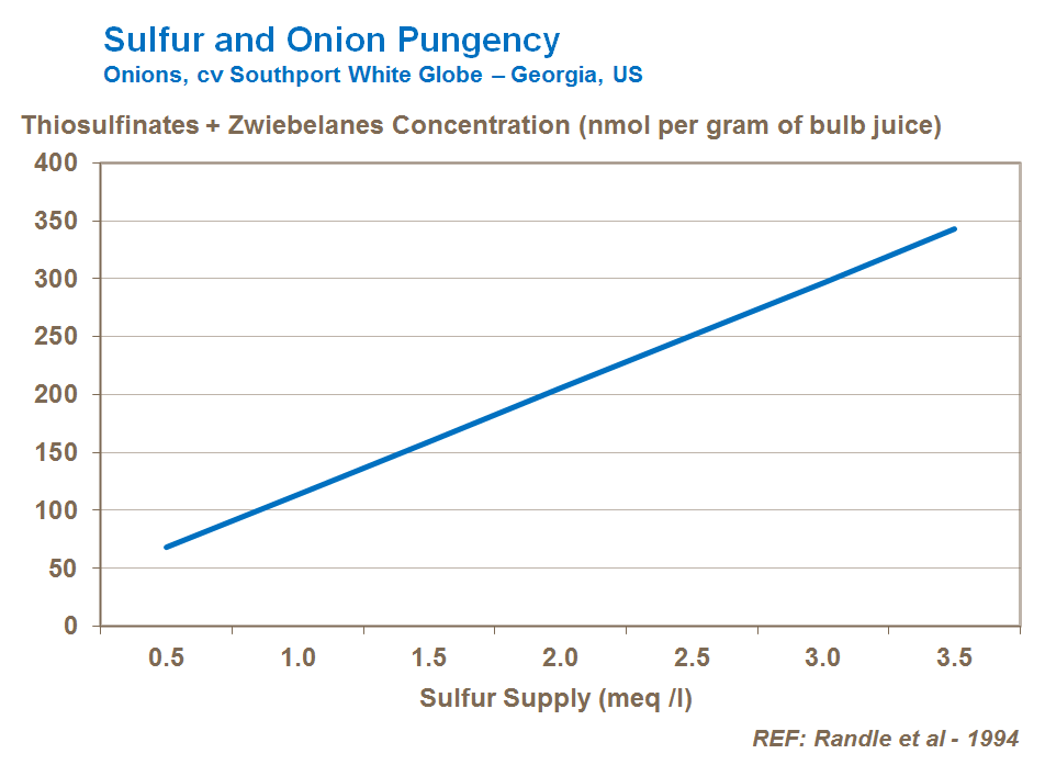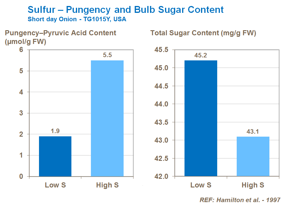 Sulfur is critical to the taste and pungency of the bulb. Supplies need to be tailored to suit the desired market requirement. Sulfur can also improve skin strength and color, and has a marked effect on the pungency of the onion through increasing the pyruvic acid content of the bulb. Therefore, it is important to use the right soil and an appropriate rate and timing of sulfur that satisfies market demands.